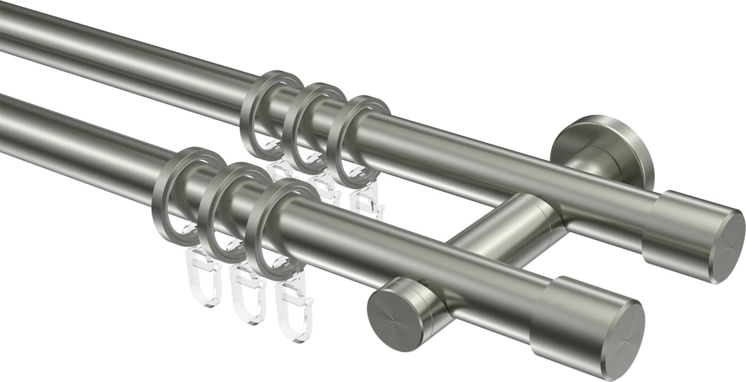 Die doppelläufige Vorhangstange Modell PERFECTA - Santo mit 20 mm Ø ist ein hochwertiges Produkt der Fensterdekoration und wurde aus Edelstahl hergestellt. Die hochwertige Verarbeitung und der moderne Stil sprechen für die Kombination der Gardinen mit unserer Stilgarnitur in Edelstahl für Ihre Fenstergestaltung. Eine gute Stabilität und gerade durch die Verwendung hochwertiger Materialen wie in diesem Fall Edelstahl, wird außerdem eine hohe Langlebigkeit dieser Produkte erreicht. Diese dekorativen doppelläufigen Stilgarnituren werden gerne für Raumgestaltung mit modernen Gardinen verwendet. Befestigen Sie Ihre Fensterdekoration an unserer Vorhangstange Modell PERFECTA - Santo. Die große Auswahl an den unterschiedlichsten Größen tragen dazu bei, dass unsere Stilgarnitur an vielen Fenstern angebracht werden kann.