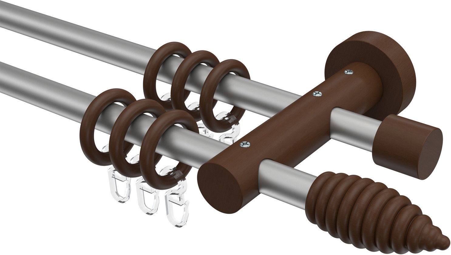 Gardinenstangen aus Metall / Holz in 16 mm Ø, 2-läufig, Modell ADRIAN - Asta Silbergrau / Nussbaum lackiert