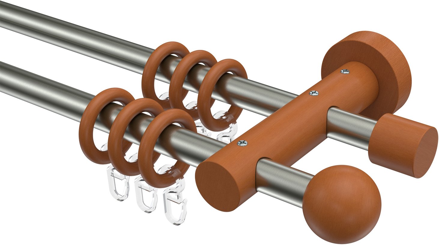 Gardinenstangen aus Metall / Holz in 16 mm Ø, 2-läufig, Modell ADRIAN - Geo Edelstahl-Optik / Kirschbaum lackiert
