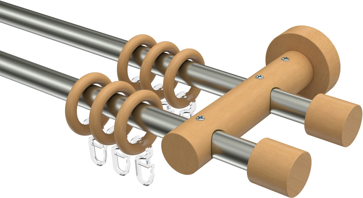 Informationen zu Gardinenstange Metall / Holz 16 mm Ø 2-läufig ADRIAN - Pin Edelstahl-Optik / Buche lackiert: