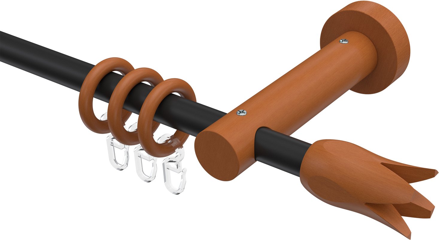 Gardinenstangen aus Metall / Holz in 16 mm Ø, 1-läufig, Modell ADRIAN - Flower Schwarz / Kirschbaum lackiert