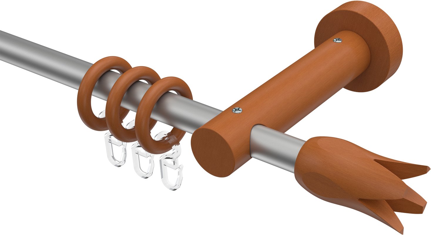 Gardinenstangen aus Metall / Holz in 16 mm Ø, 1-läufig, Modell ADRIAN - Flower Silbergrau / Kirschbaum lackiert