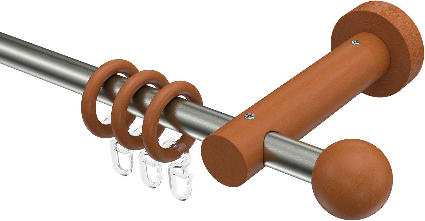 Gardinenstangen aus Metall / Holz in 16 mm Ø, 1-läufig, Modell ADRIAN - Geo Edelstahl-Optik / Kirschbaum lackiert