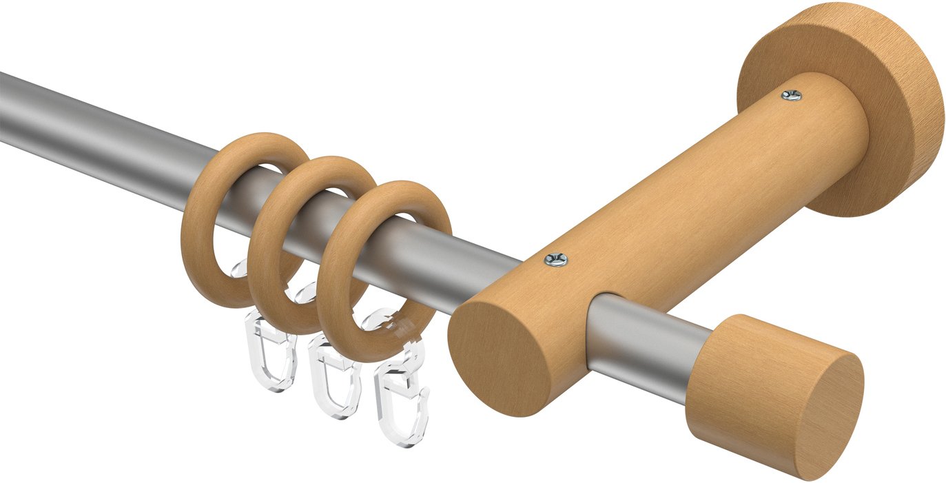 Gardinenstangen aus Metall / Holz in 16 mm Ø, 1-läufig, Modell ADRIAN - Pin Silbergrau / Buche lackiert