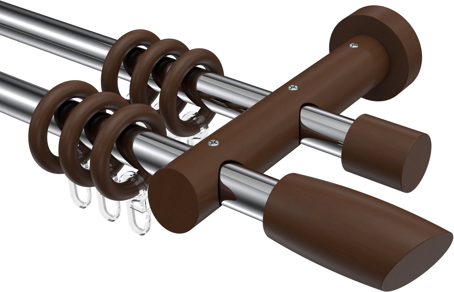 Gardinenstangen aus Metall / Holz in 20 mm Ø, 2-läufig, Modell TALENA - Etta Chrom / Nussbaum lackiert