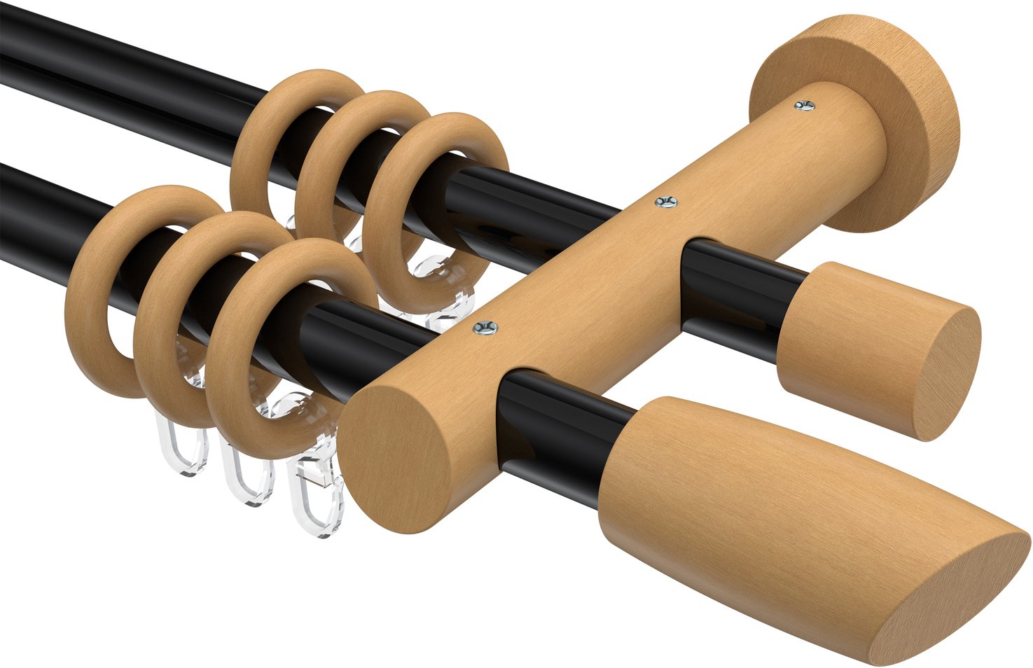 Gardinenstangen aus Metall / Holz in 20 mm Ø, 2-läufig, Modell TALENA - Etta Schwarz / Buche lackiert