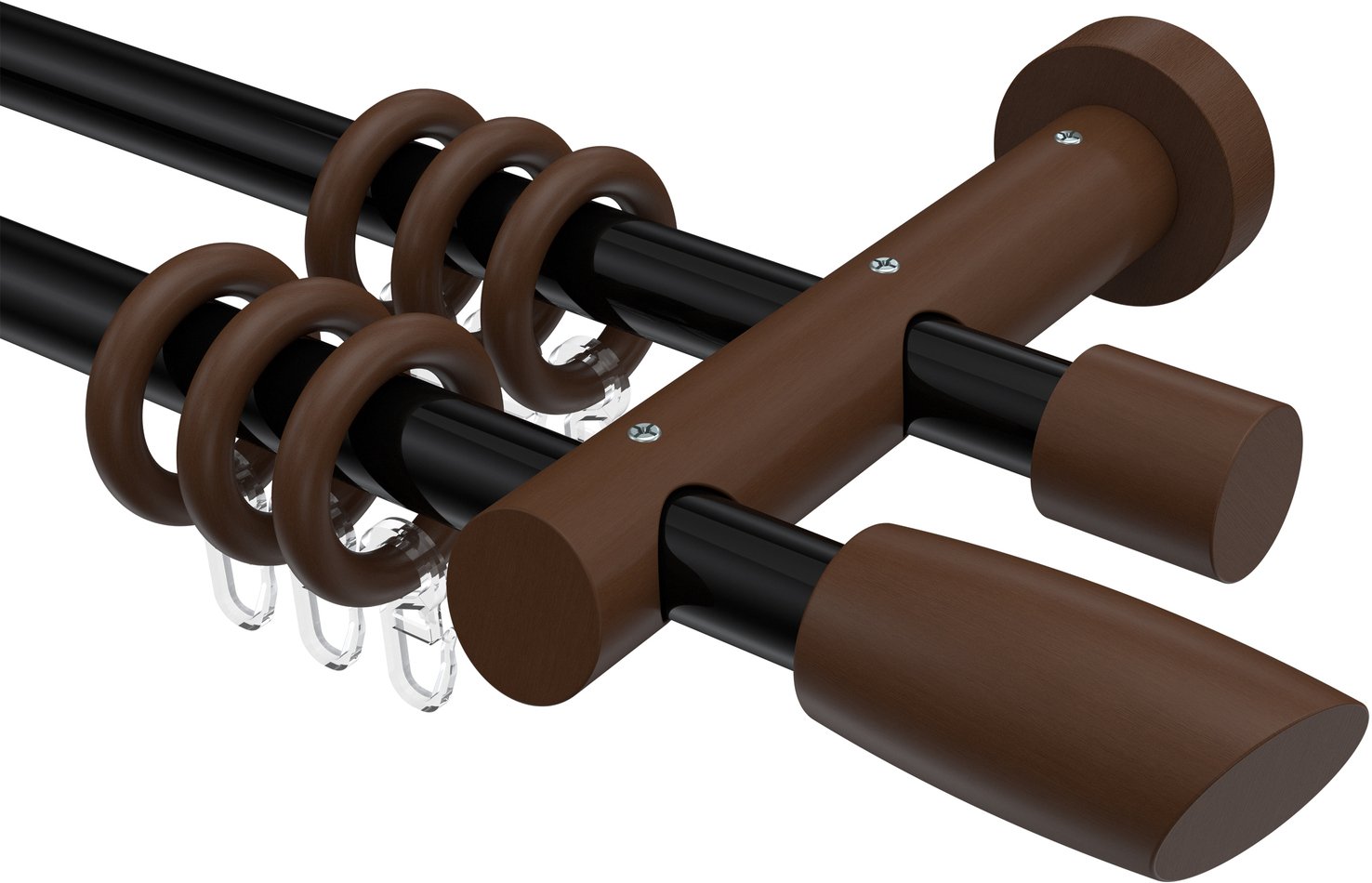 Gardinenstangen aus Metall / Holz in 20 mm Ø, 2-läufig, Modell TALENA - Etta Schwarz / Nussbaum lackiert