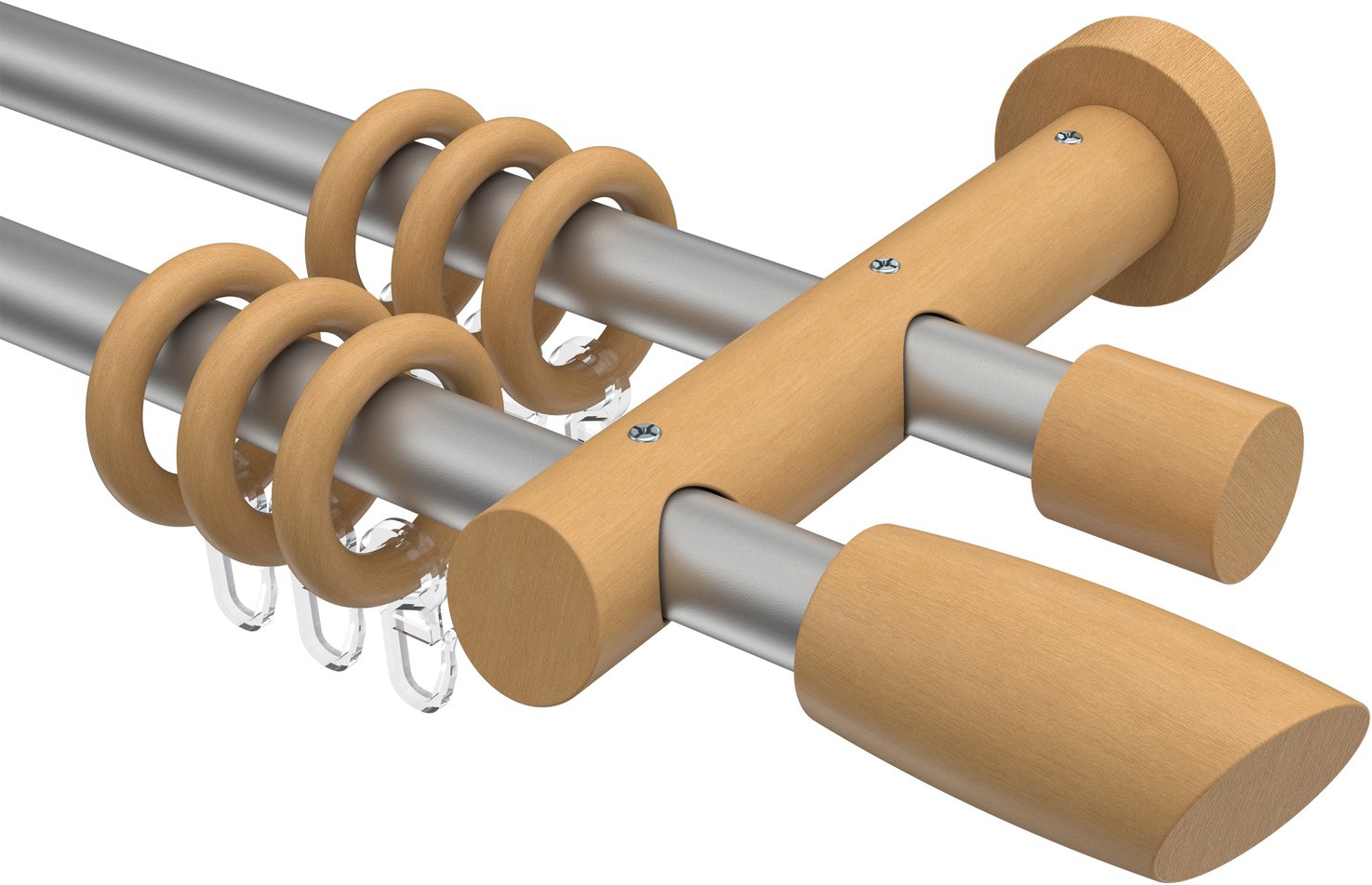 Gardinenstangen aus Metall / Holz in 20 mm Ø, 2-läufig, Modell TALENA - Etta Silbergrau / Buche lackiert
