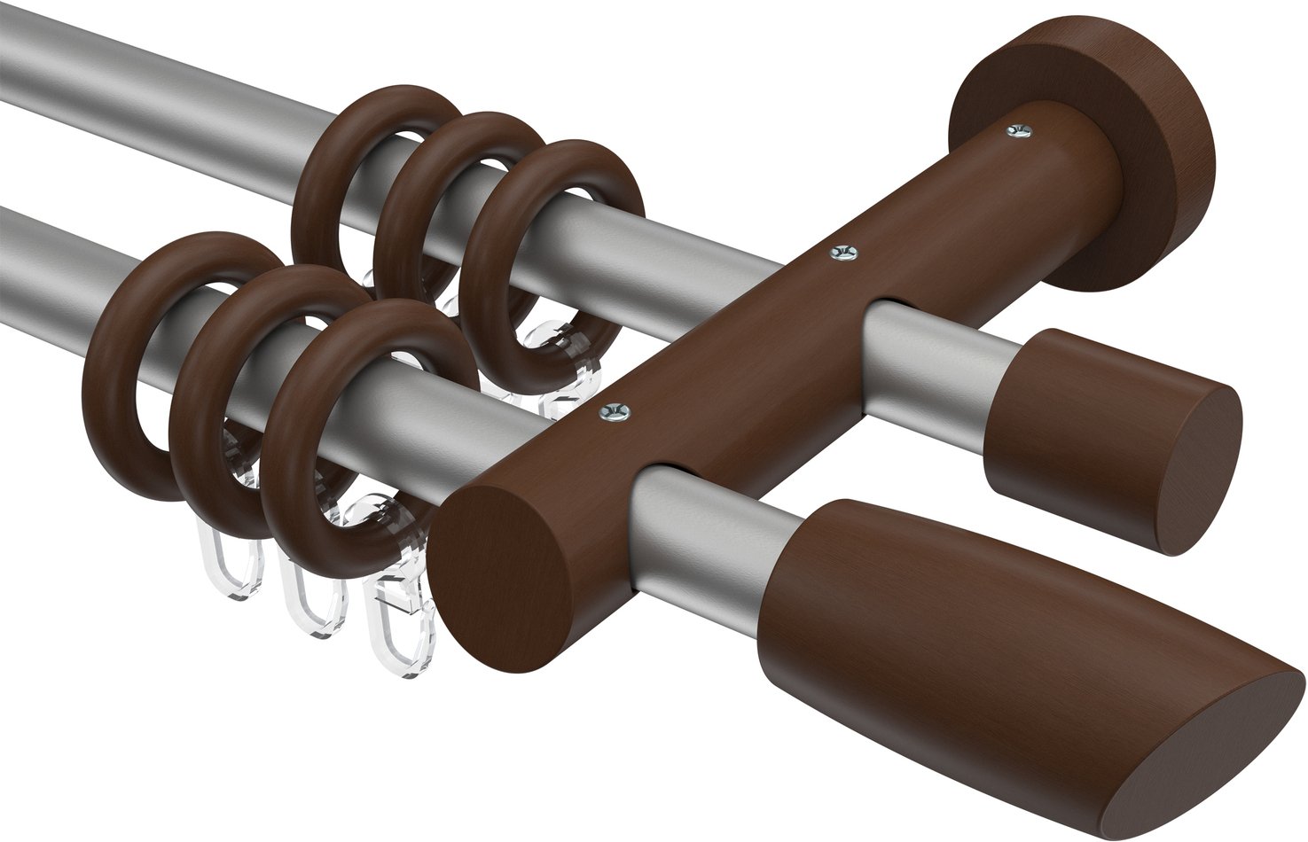 Gardinenstangen aus Metall / Holz in 20 mm Ø, 2-läufig, Modell TALENA - Etta Silbergrau / Nussbaum lackiert