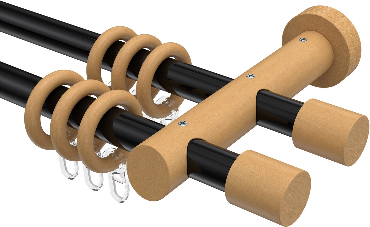 Gardinenstangen aus Metall / Holz in 20 mm Ø, 2-läufig, Modell TALENA - Feta Schwarz / Buche lackiert