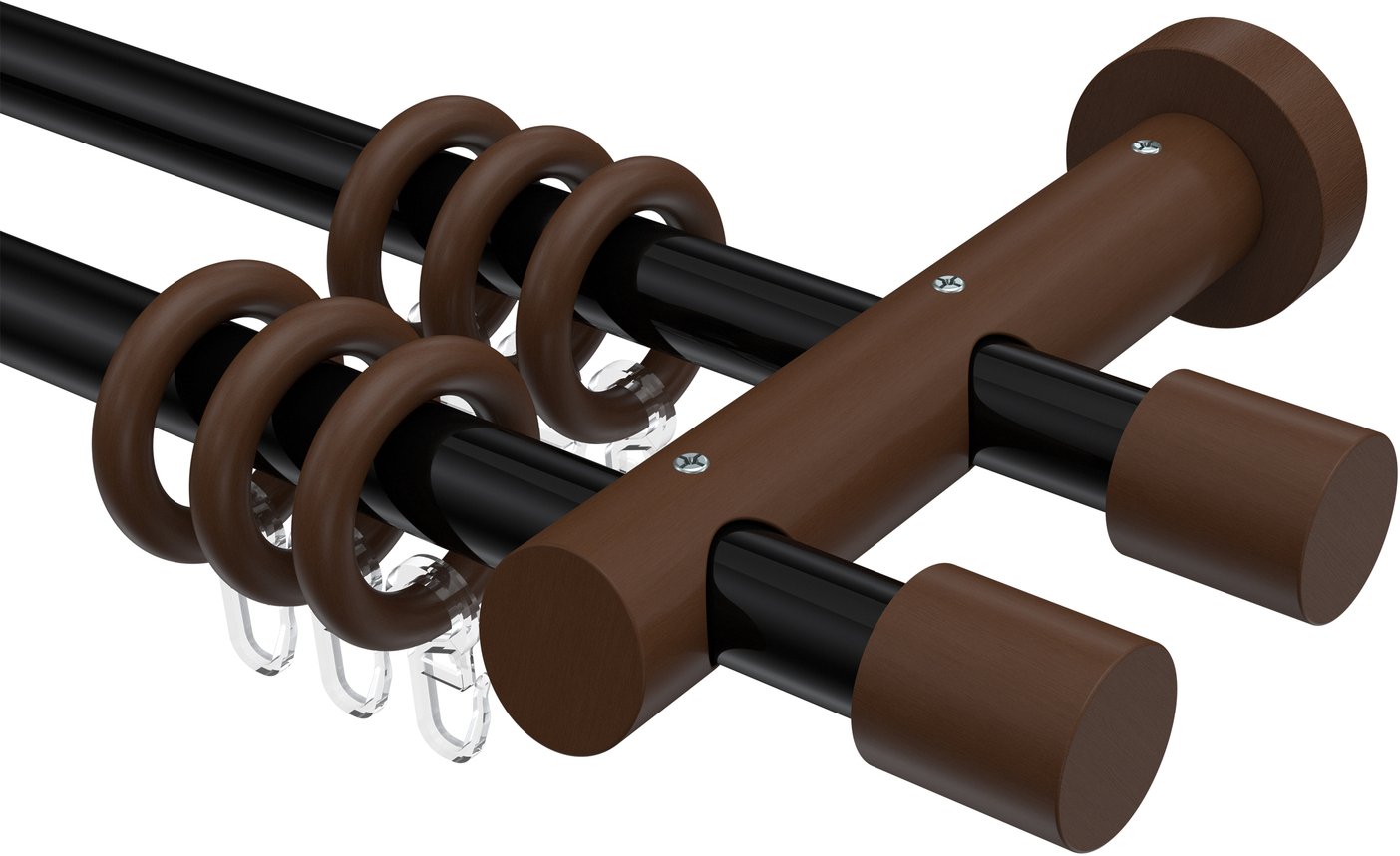 Gardinenstangen aus Metall / Holz in 20 mm Ø, 2-läufig, Modell TALENA - Feta Schwarz / Nussbaum lackiert