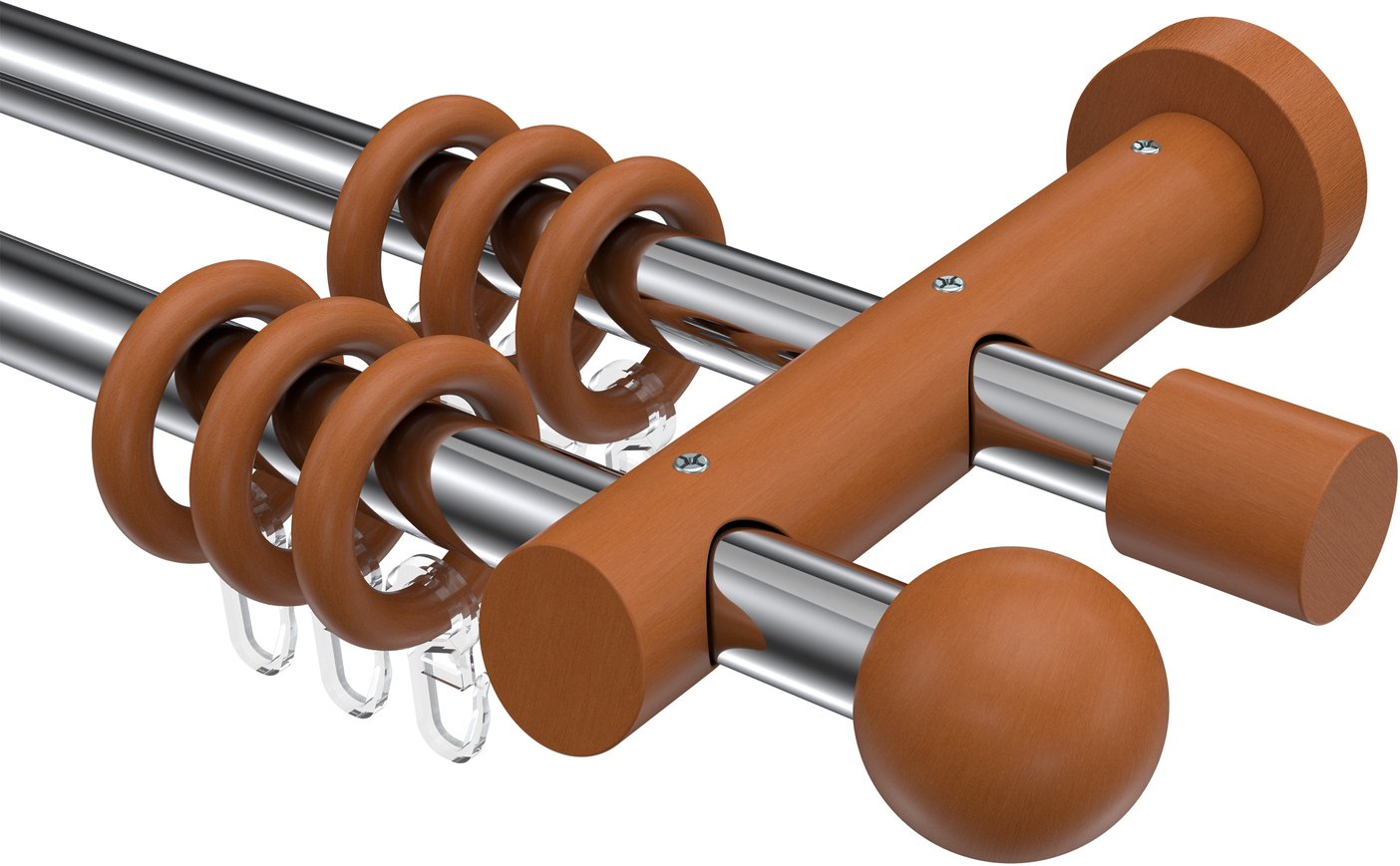 Gardinenstangen aus Metall / Holz in 20 mm Ø, 2-läufig, Modell TALENA - Luina Chrom / Kirschbaum lackiert