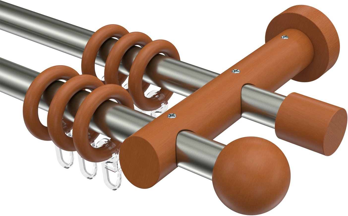 Gardinenstangen aus Metall / Holz in 20 mm Ø, 2-läufig, Modell TALENA - Luina Edelstahl-Optik / Kirschbaum lackiert