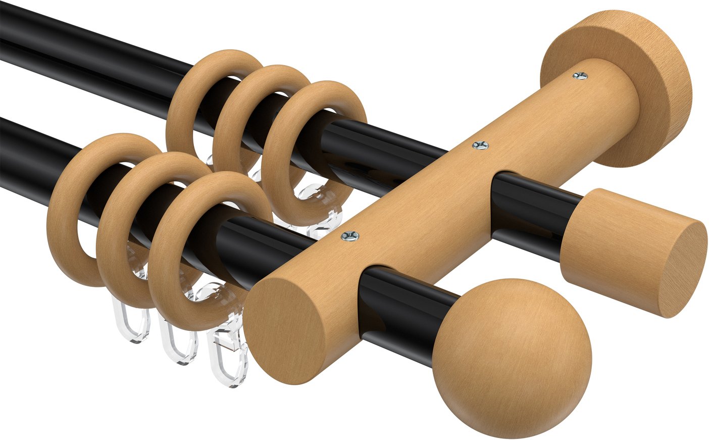 Gardinenstangen aus Metall / Holz in 20 mm Ø, 2-läufig, Modell TALENA - Luina Schwarz / Buche lackiert