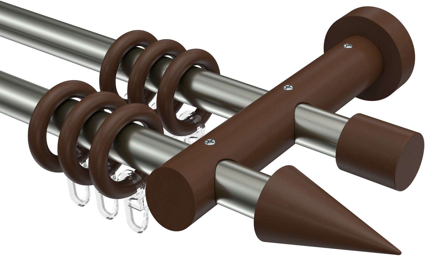 Gardinenstangen aus Metall / Holz in 20 mm Ø, 2-läufig, Modell TALENA - Siveo Edelstahl-Optik / Nussbaum lackiert