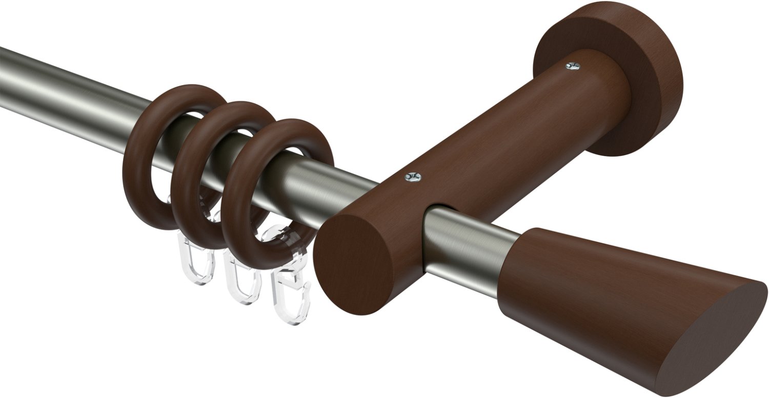 Gardinenstangen aus Metall / Holz in 20 mm Ø, 1-läufig, Modell TALENA - Bero Edelstahl-Optik / Nussbaum lackiert