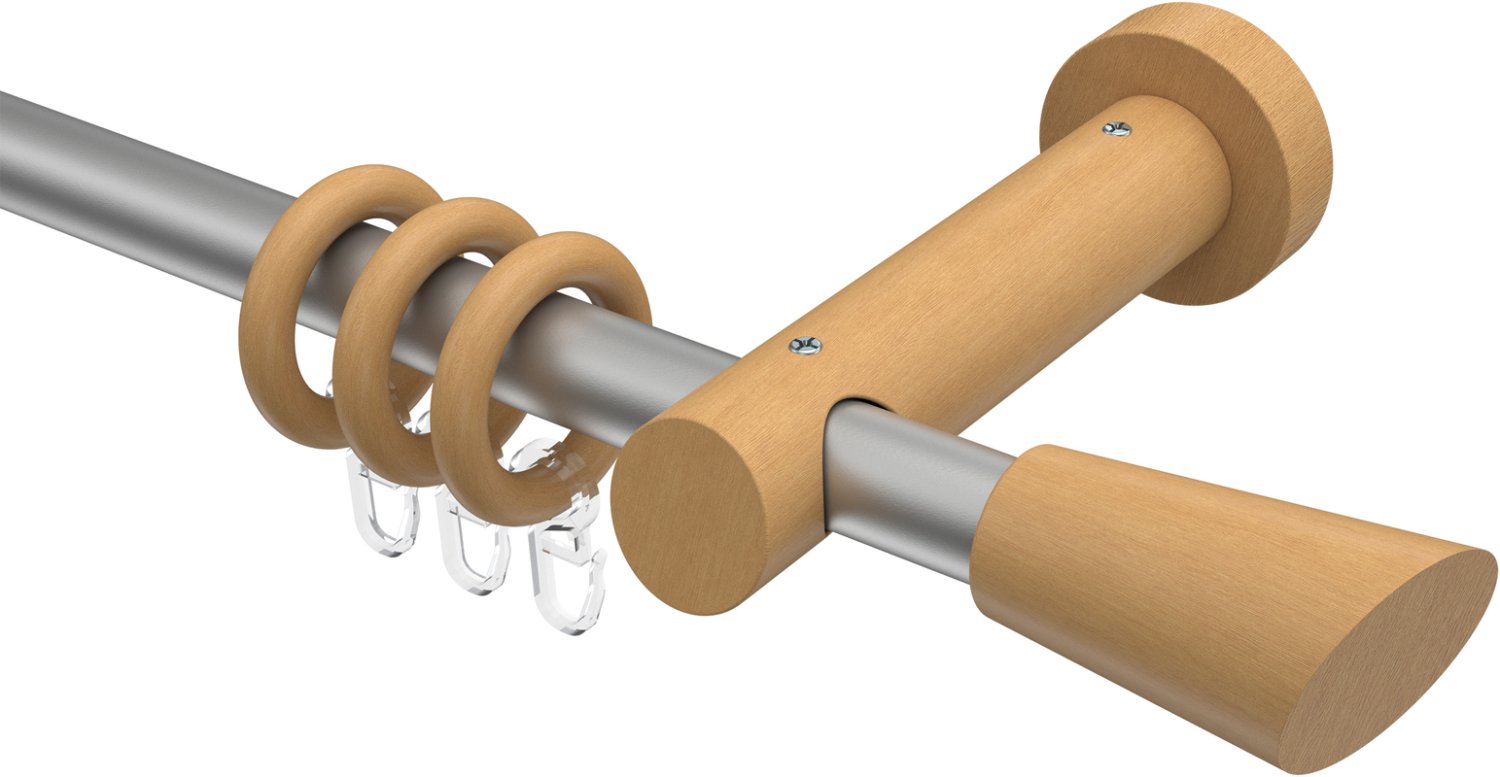 Gardinenstangen aus Metall / Holz in 20 mm Ø, 1-läufig, Modell TALENA - Bero Silbergrau / Buche lackiert