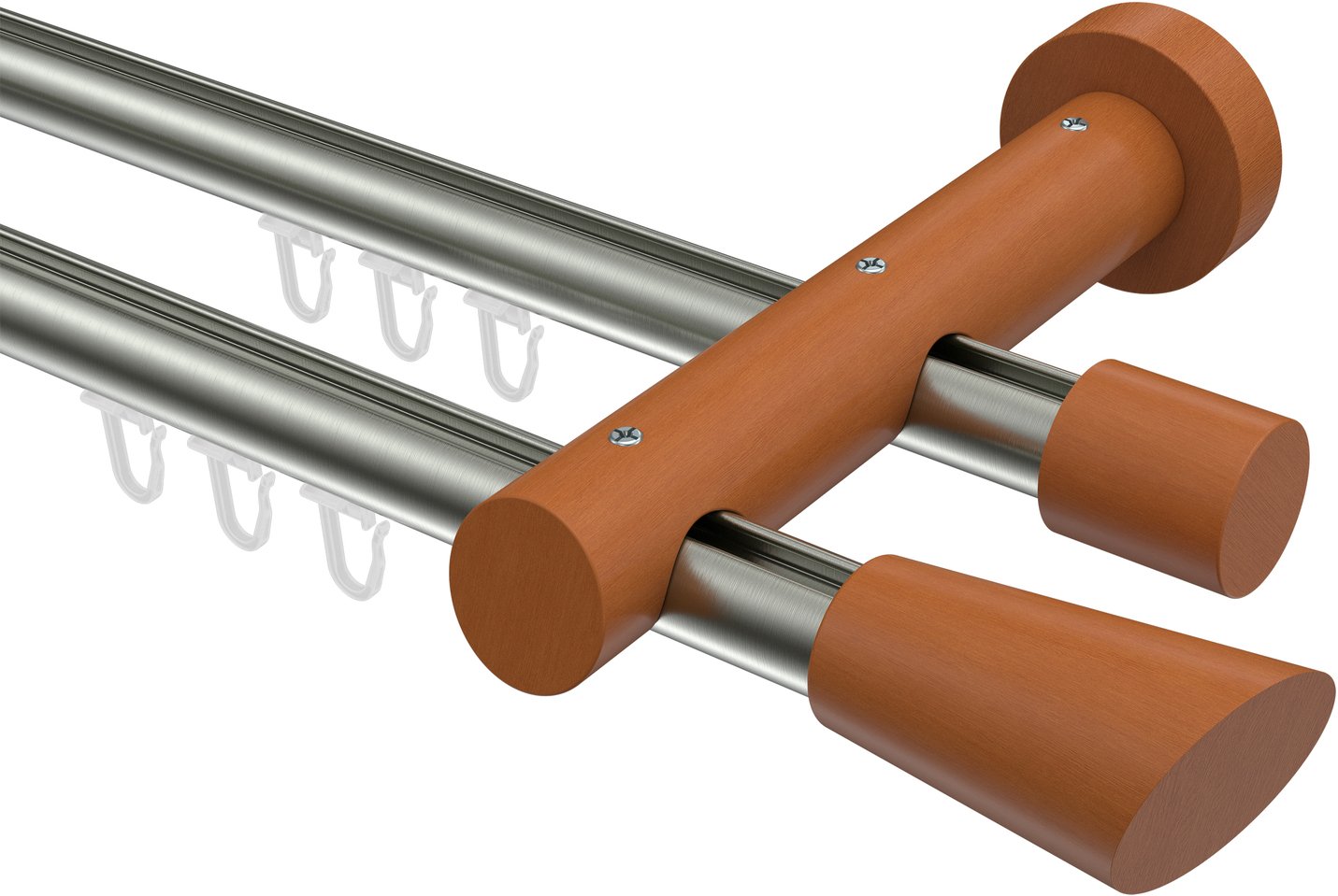 Gardinenstangen mit Innenlauf aus Aluminium / Holz in 20 mm Ø, 2-läufig, Modell TALENT - Bero Edelstahl-Optik / Kirschbaum lackiert