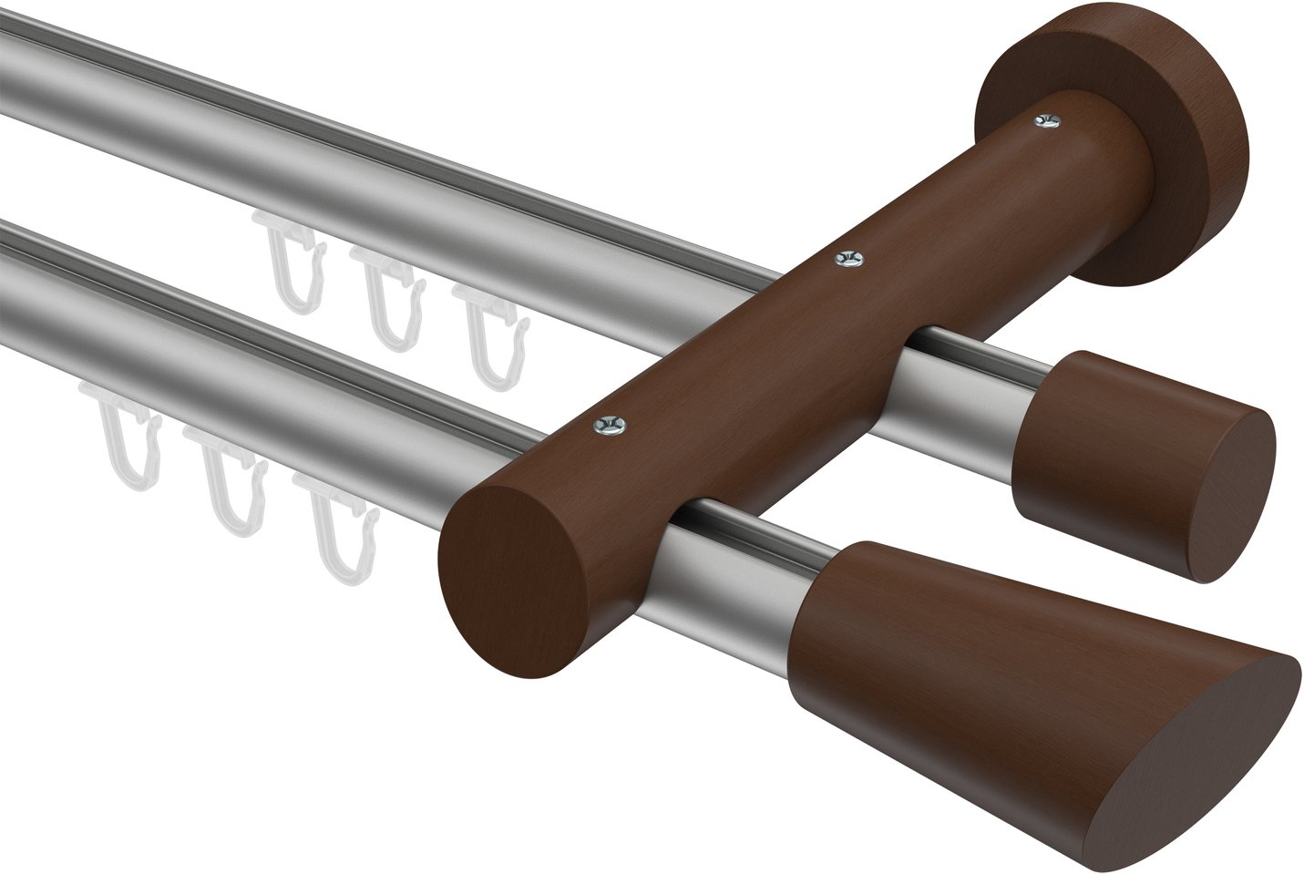 Gardinenstangen mit Innenlauf aus Aluminium / Holz in 20 mm Ø, 2-läufig, Modell TALENT - Bero Silbergrau / Nussbaum lackiert