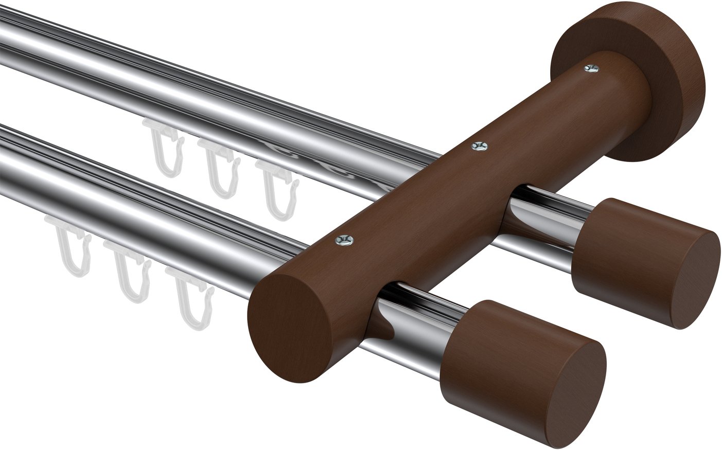 Gardinenstangen mit Innenlauf aus Aluminium / Holz in 20 mm Ø, 2-läufig, Modell TALENT - Feta Chrom / Nussbaum lackiert