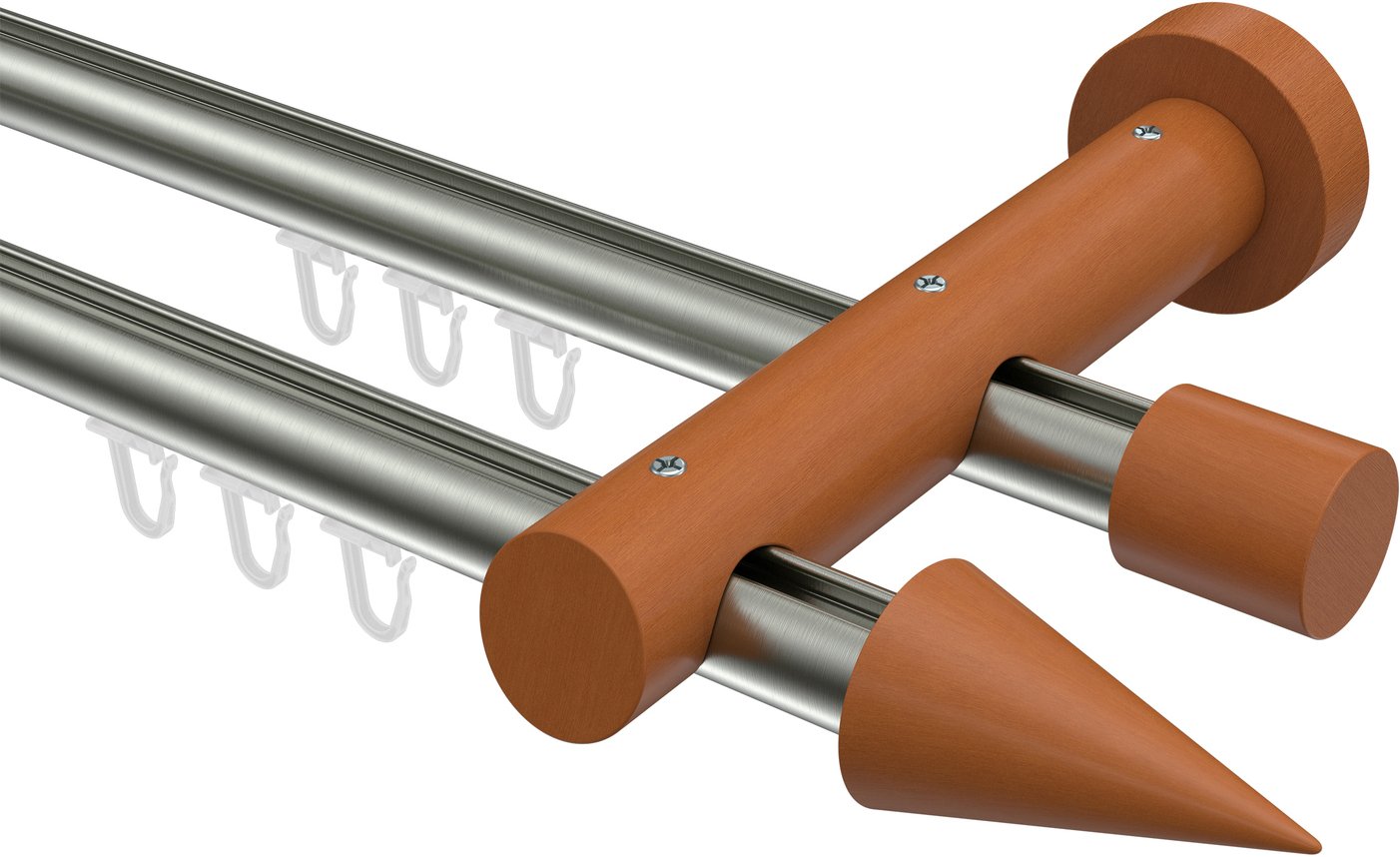 Gardinenstangen mit Innenlauf aus Aluminium / Holz in 20 mm Ø, 2-läufig, Modell TALENT - Siveo Edelstahl-Optik / Kirschbaum lackiert