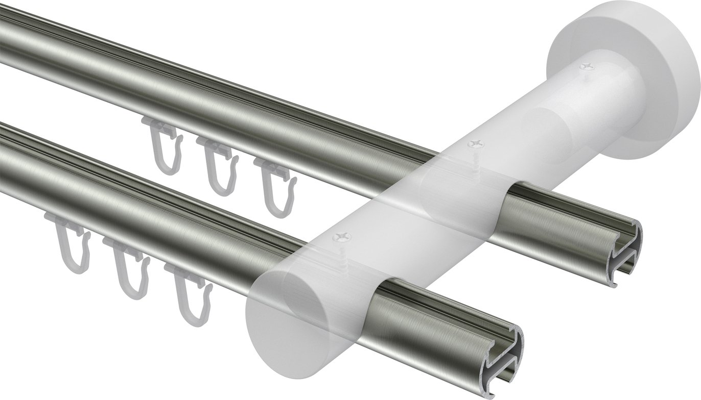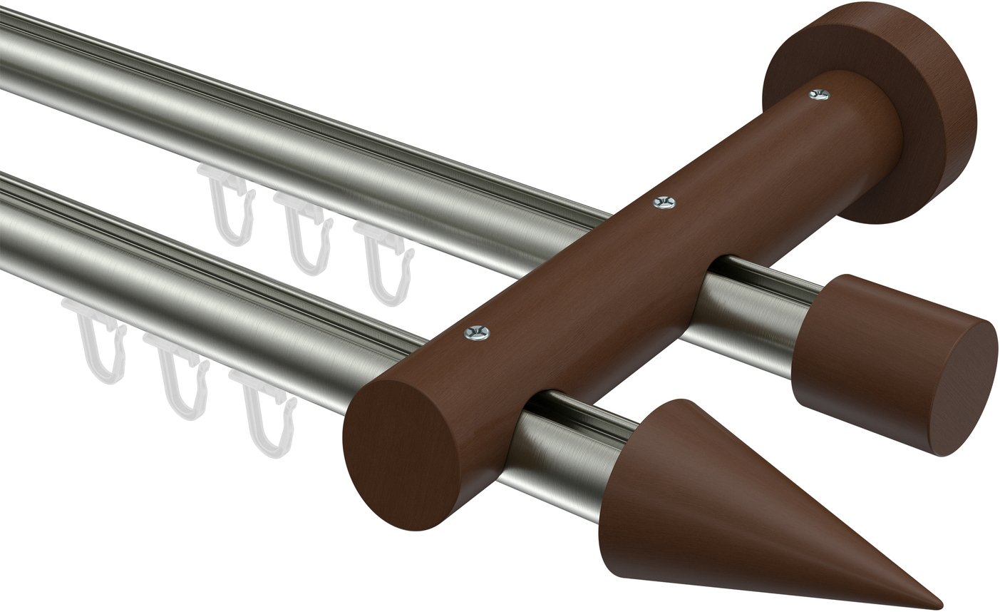 Gardinenstangen mit Innenlauf aus Aluminium / Holz in 20 mm Ø, 2-läufig, Modell TALENT - Siveo Edelstahl-Optik / Nussbaum lackiert