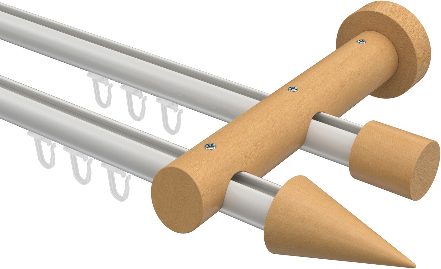 Gardinenstangen mit Innenlauf aus Aluminium / Holz in 20 mm Ø, 2-läufig, Modell TALENT - Siveo Weiß / Buche lackiert