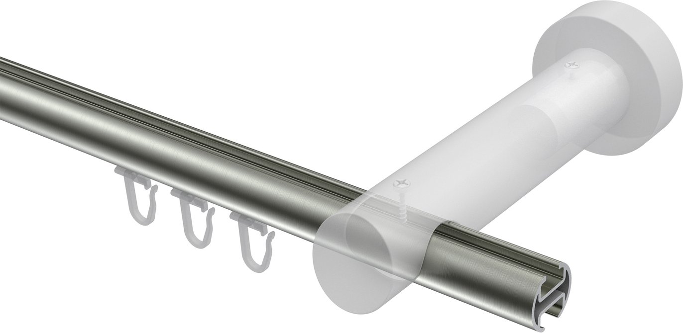 Gardinenstangen mit Innenlauf aus Aluminium / Holz in 20 mm Ø, 1-läufig, Modell TALENT - Feta Edelstahl-Optik / Nussbaum lackiert