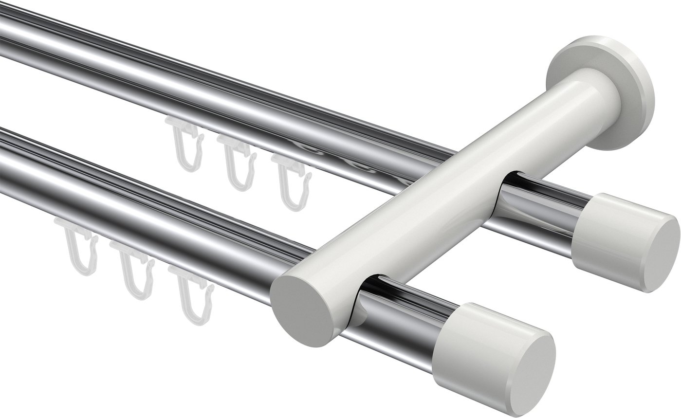 Gardinenstangen mit Innenlauf aus Aluminium / Metall in 20 mm Ø, 2-läufig, Modell PLATON - Santo Chrom / Weiß