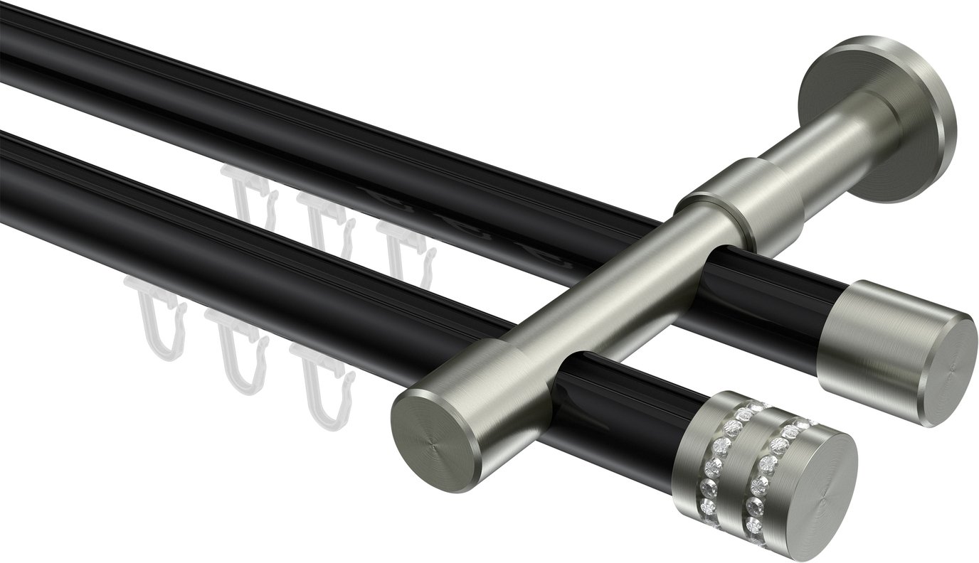 Gardinenstangen mit Innenlauf aus Aluminium / Metall in 20 mm Ø, 2-läufig, Modell PRESTIGE - Estana Schwarz / Edelstahl-Optik