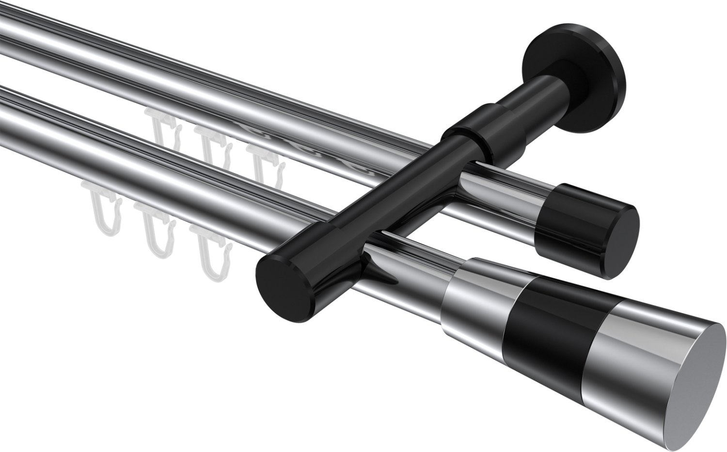 Gardinenstangen mit Innenlauf aus Aluminium / Metall in 20 mm Ø, 2-läufig, Modell PRESTIGE - Tanara Chrom / Schwarz