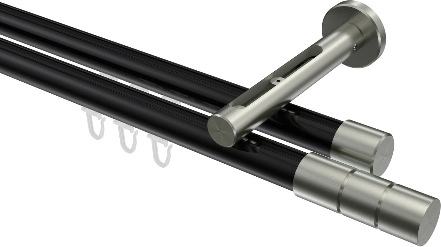Gardinenstangen mit Innenlauf aus Aluminium / Metall in 20 mm Ø, 2-läufig, Modell SITENO - Elanto Schwarz / Edelstahl-Optik
