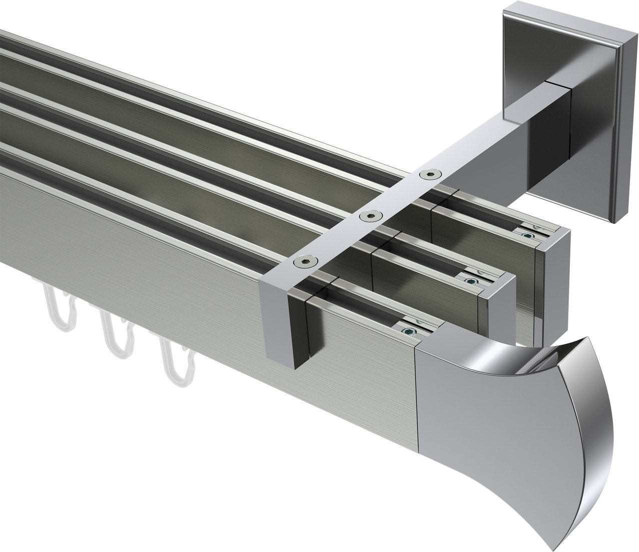 Gardinenstangen mit eckigem Innenlauf aus Aluminium / Metall in 14x35 mm, 3-läufig, Modell SMARTLINE - Conex Edelstahl-Optik / Chrom (Wandabstand lang)