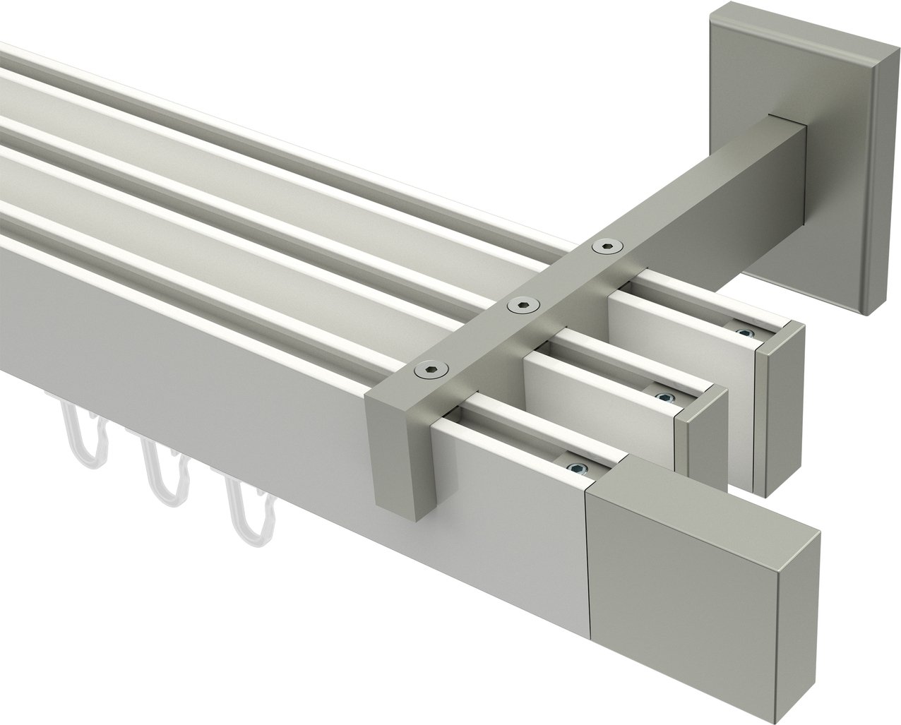 Gardinenstangen mit eckigem Innenlauf aus Aluminium / Metall in 14x35 mm, 3-läufig, Modell SMARTLINE - Lox Weiß / Edelstahl-Optik (Wandabstand lang)