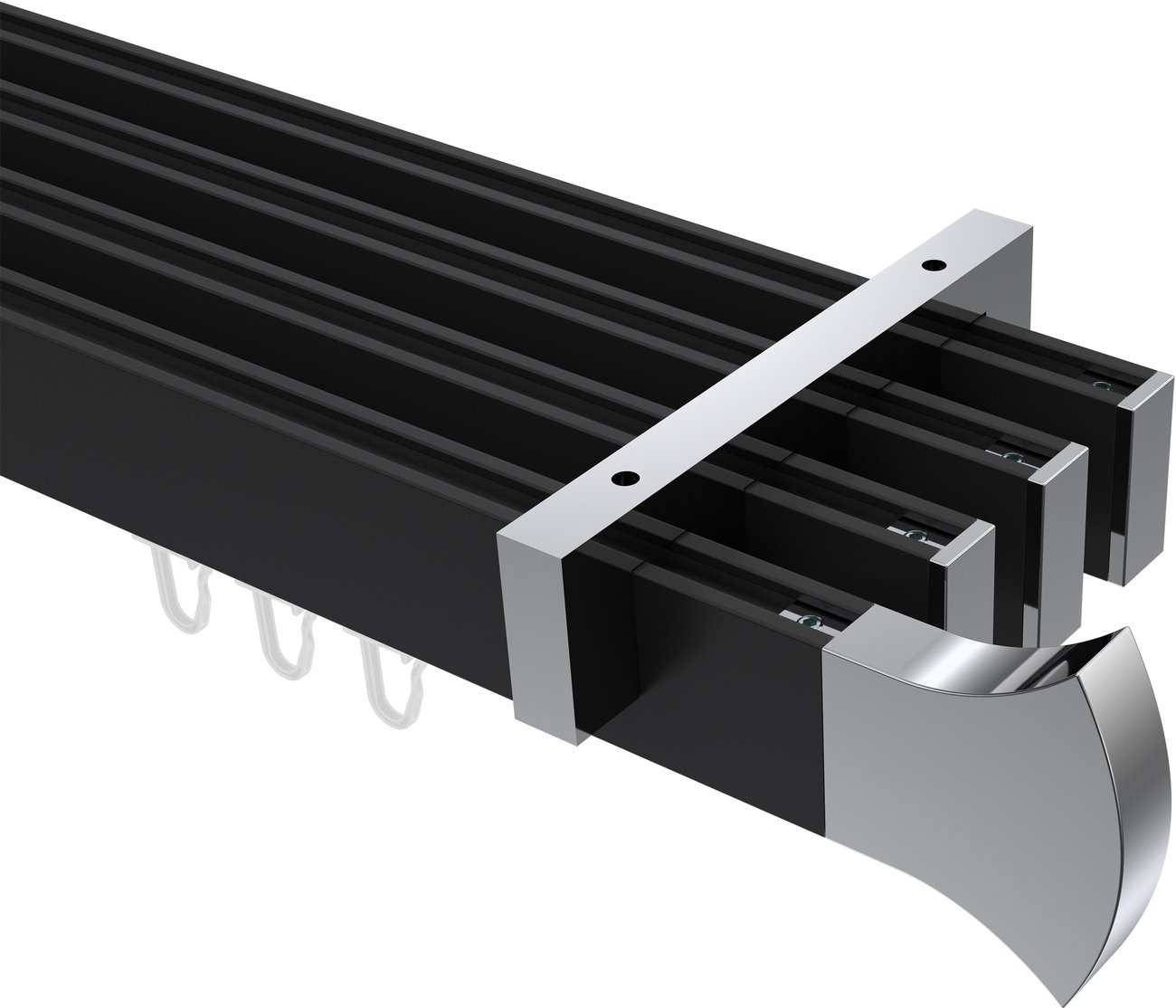 Gardinenstangen mit eckigem Innenlauf Deckenmontage aus Aluminium / Metall in 14x35 mm, 4-läufig, Modell SMARTLINE - Conex Schwarz / Chrom
