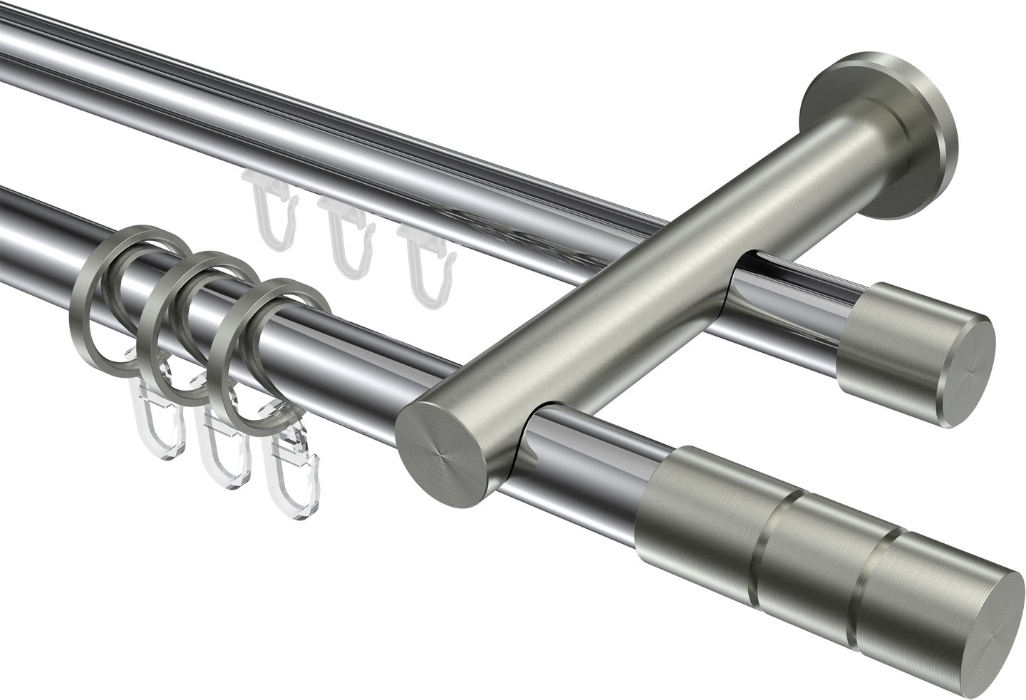 Rundrohr-Innenlauf Gardinenstangen aus Aluminium / Metall in 20 mm Ø, 2-läufig, Modell PLATON - Elanto Chrom / Edelstahl-Optik