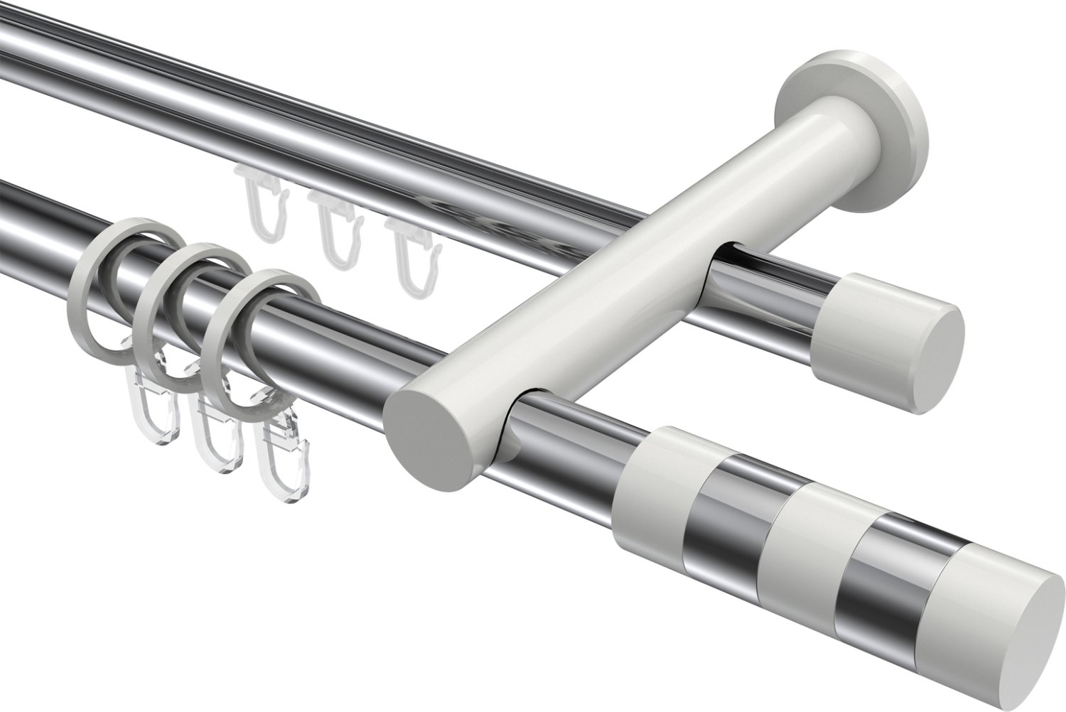 Rundrohr-Innenlauf Gardinenstangen aus Aluminium / Metall in 20 mm Ø, 2-läufig, Modell PLATON - Mavell Chrom / Weiß