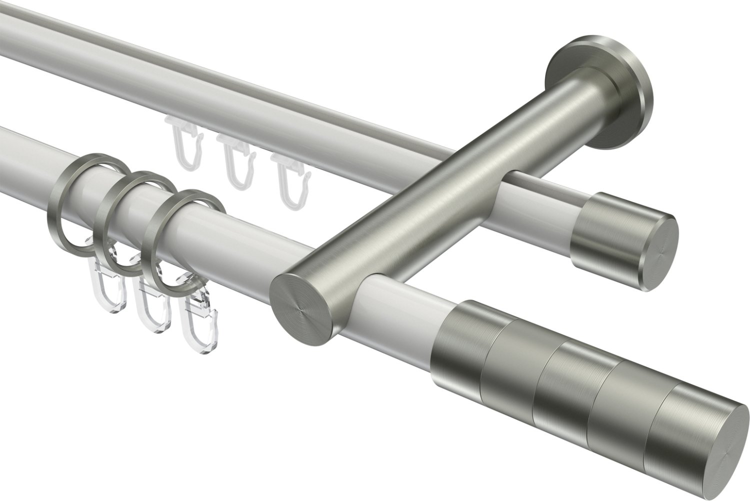 Rundrohr-Innenlauf Gardinenstangen aus Aluminium / Metall in 20 mm Ø, 2-läufig, Modell PLATON - Mavell Weiß / Edelstahl-Optik