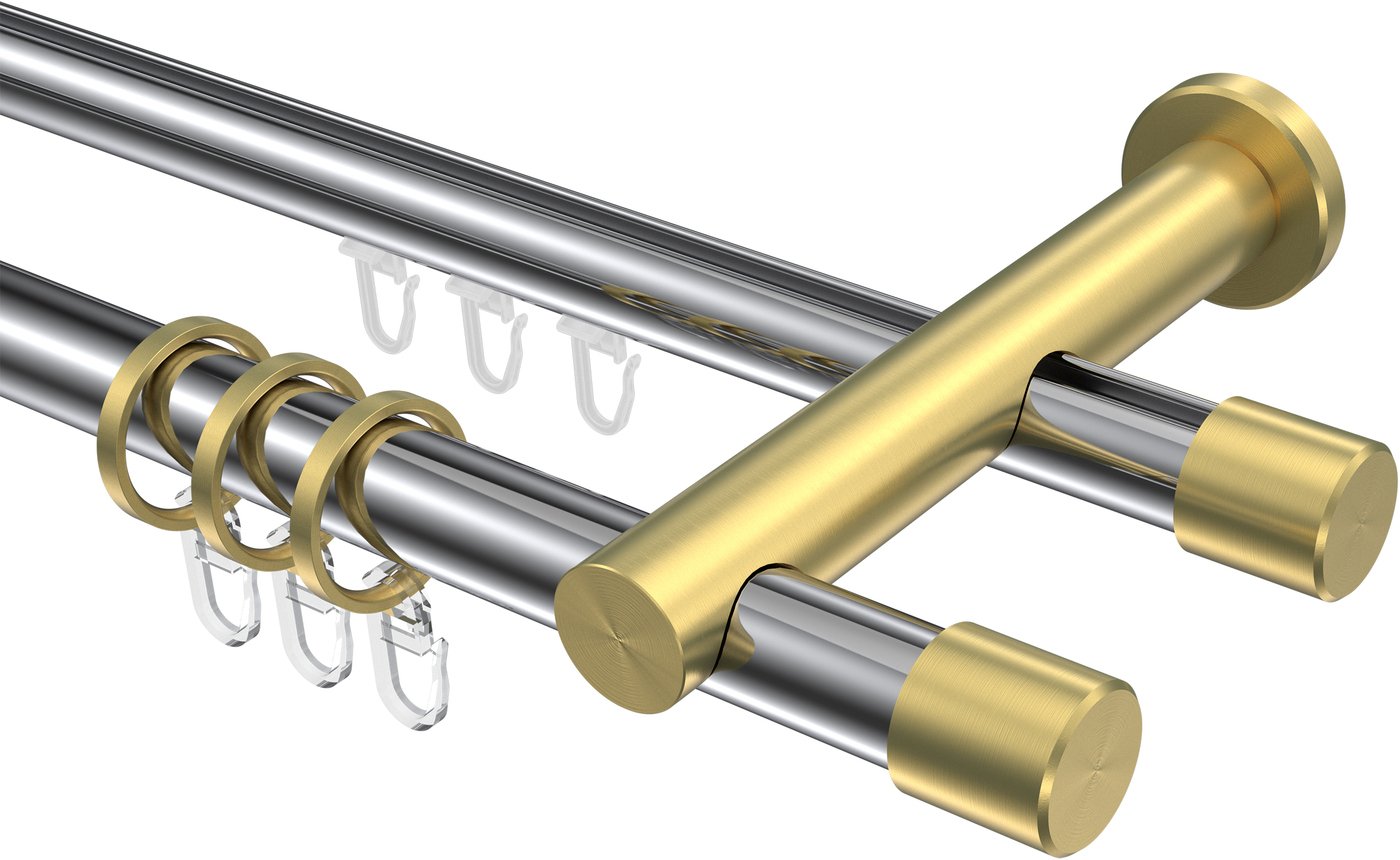 Rundrohr-Innenlauf Gardinenstangen aus Aluminium / Metall in 20 mm Ø, 2-läufig, Modell PLATON - Santo Chrom / Messing-Optik