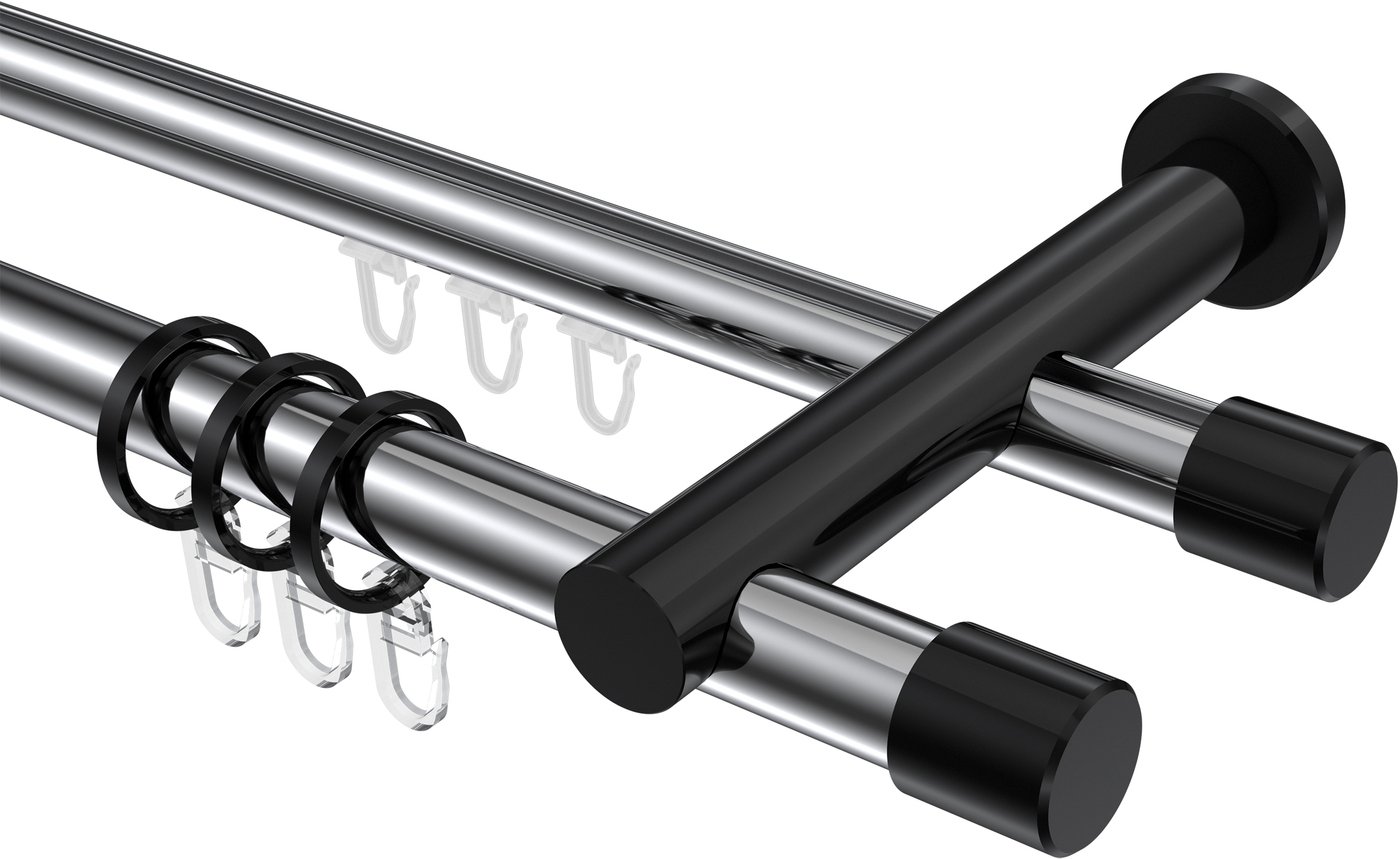 Rundrohr-Innenlauf Gardinenstangen aus Aluminium / Metall in 20 mm Ø, 2-läufig, Modell PLATON - Santo Chrom / Schwarz