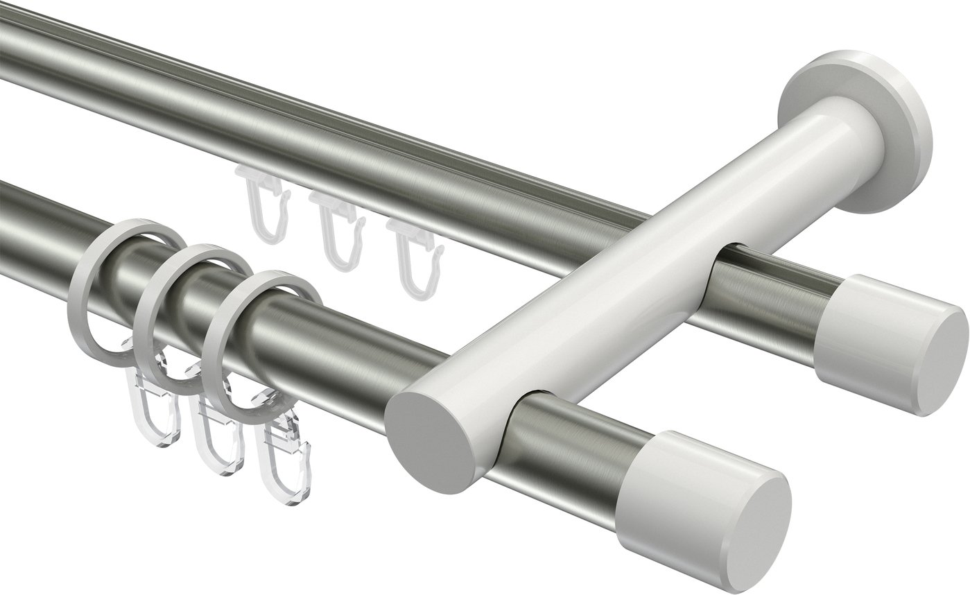 Rundrohr-Innenlauf Gardinenstangen aus Aluminium / Metall in 20 mm Ø, 2-läufig, Modell PLATON - Santo Edelstahl-Optik / Weiß