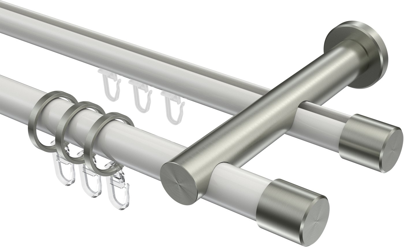 Rundrohr-Innenlauf Gardinenstangen aus Aluminium / Metall in 20 mm Ø, 2-läufig, Modell PLATON - Santo Weiß / Edelstahl-Optik