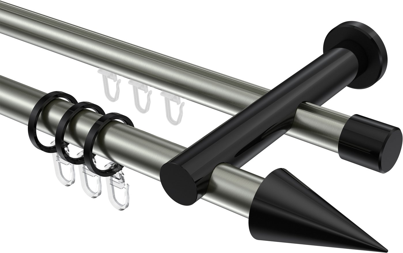Rundrohr-Innenlauf Gardinenstangen aus Aluminium / Metall in 20 mm Ø, 2-läufig, Modell PLATON - Savio Edelstahl-Optik / Schwarz
