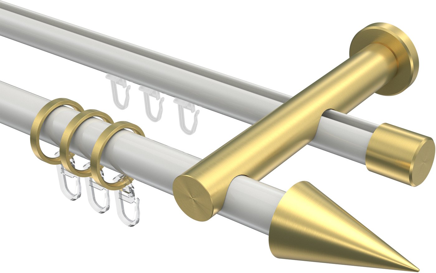 Rundrohr-Innenlauf Gardinenstangen aus Aluminium / Metall in 20 mm Ø, 2-läufig, Modell PLATON - Savio Weiß / Messing-Optik