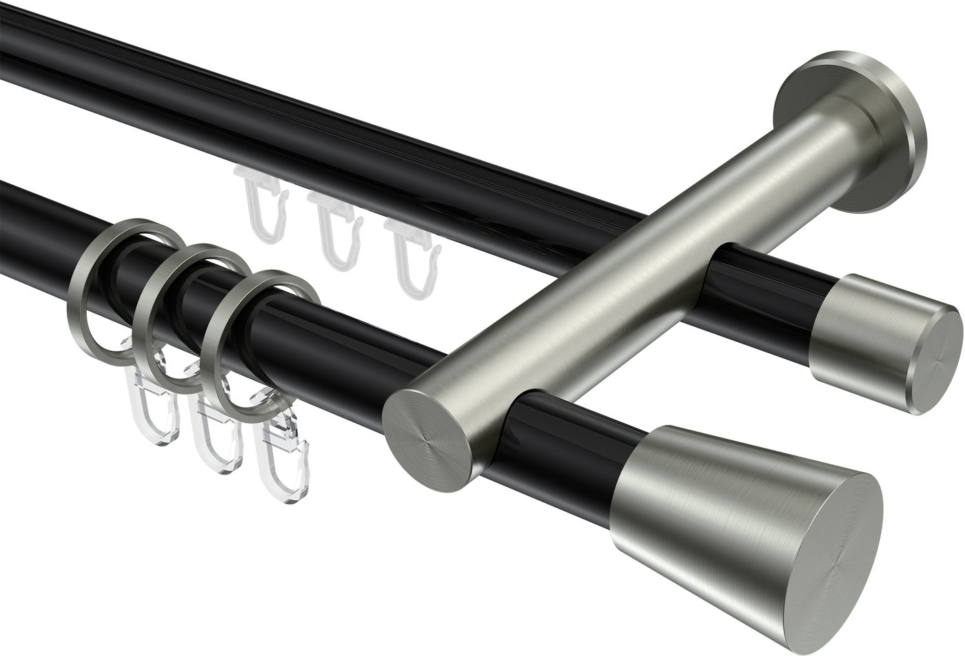 Rundrohr-Innenlauf Gardinenstangen aus Aluminium / Metall in 20 mm Ø, 2-läufig, Modell PLATON - Sitra Schwarz / Edelstahl-Optik
