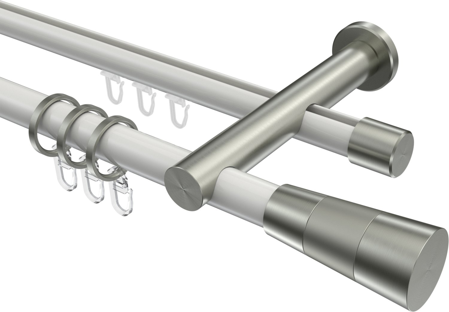 Rundrohr-Innenlauf Gardinenstangen aus Aluminium / Metall in 20 mm Ø, 2-läufig, Modell PLATON - Tanara Weiß / Edelstahl-Optik
