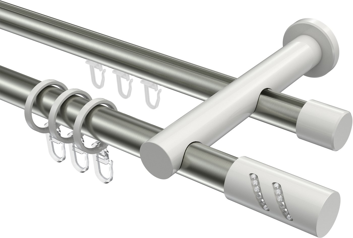 Rundrohr-Innenlauf Gardinenstangen aus Aluminium / Metall in 20 mm Ø, 2-läufig, Modell PLATON - Zoena Edelstahl-Optik / Weiß