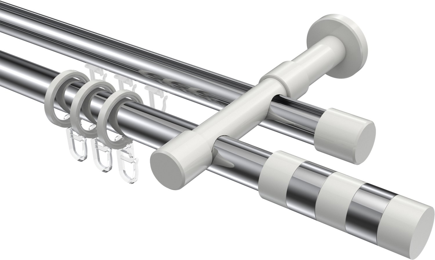 Rundrohr-Innenlauf Gardinenstangen aus Aluminium / Metall in 20 mm Ø, 2-läufig, Modell PRESTIGE - Mavell Chrom / Weiß