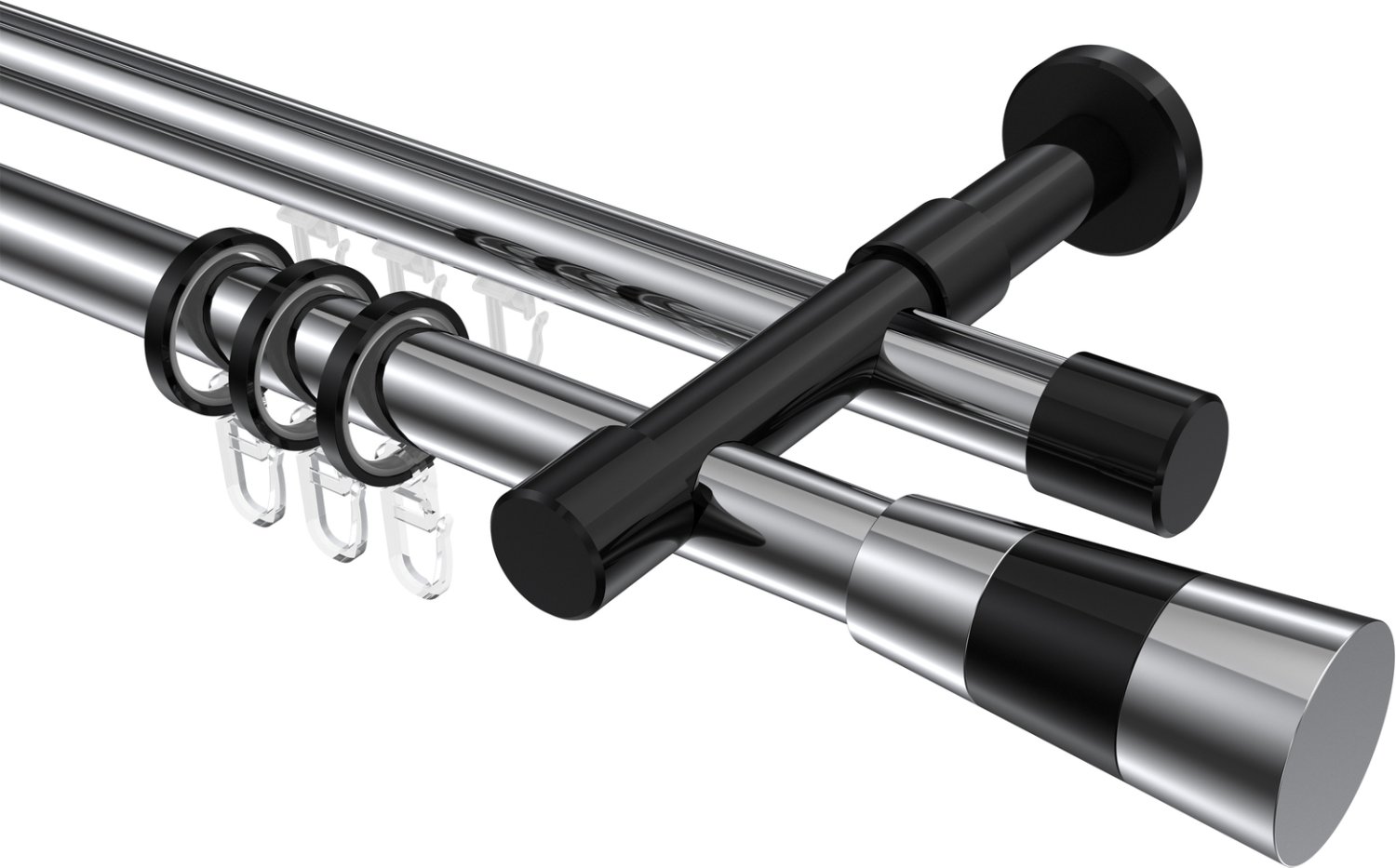 Rundrohr-Innenlauf Gardinenstangen aus Aluminium / Metall in 20 mm Ø, 2-läufig, Modell PRESTIGE - Tanara Chrom / Schwarz