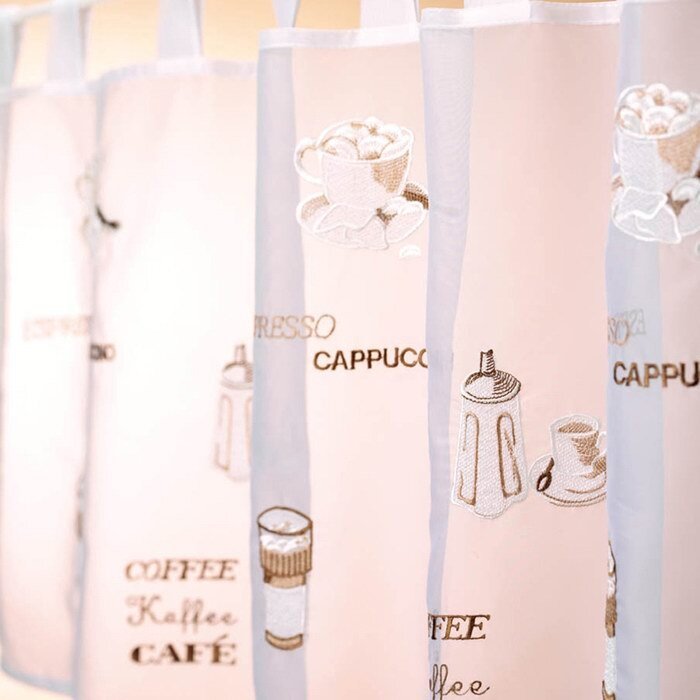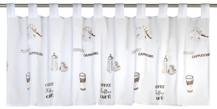 Wunderschöne bestickte Kaffeemotive, wie zum Beispiel Kaffeetassen, Zuckerstreuer und Schriftzüge wie Coffee, Kaffee, Café, Espresso und Cappuccino machten aus dieser weißen Scheibengardine eine sehr schönes Accessoire für Ihr Fenster.